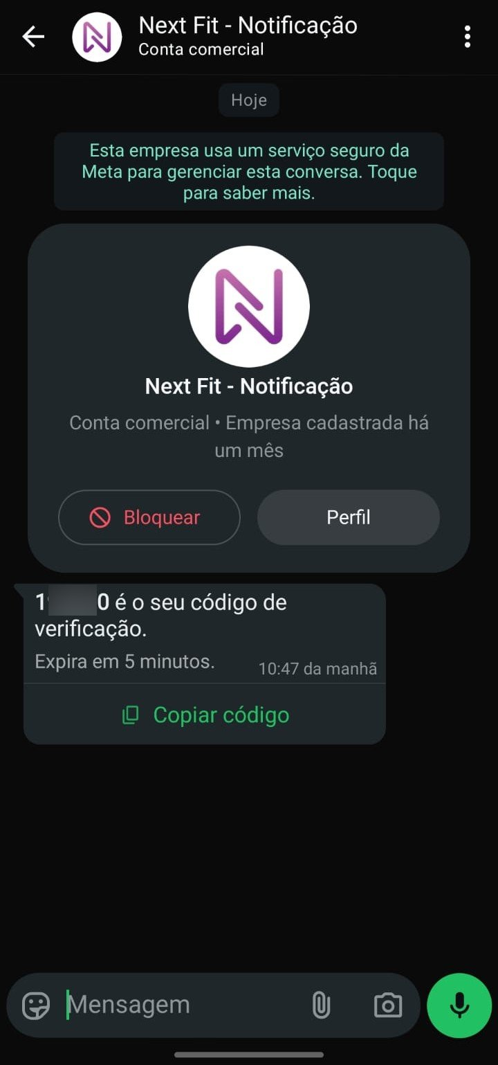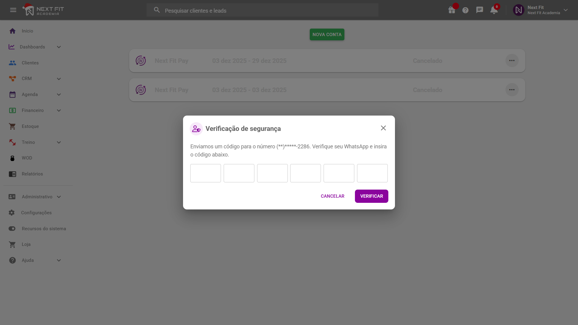 Como medida de segurança, será encaminhada uma mensagem com um código de 6 (seis) dígitos via WhatsApp para o número cadastrado no titular do sistema Next Fit. Este código deve ser confirmado no sistema para iniciar a ativação da conta do Next Fit Pay.