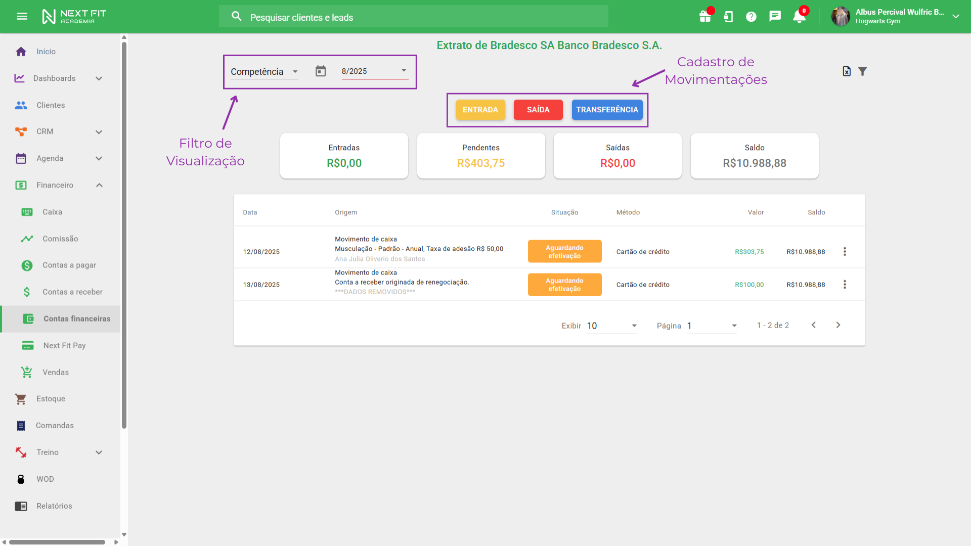 No extrato, registre entradas, saídas e transferências que ocorreram na conta bancária em questão nos botões de ENTRADA, SAÍDA e TRANSFERÊNCIA. Altere a Competência para analisar movimentações de períodos diferentes do atual. Utilize o filtro para encontrar movimentações específicas por cliente, método de pagamento e situação.