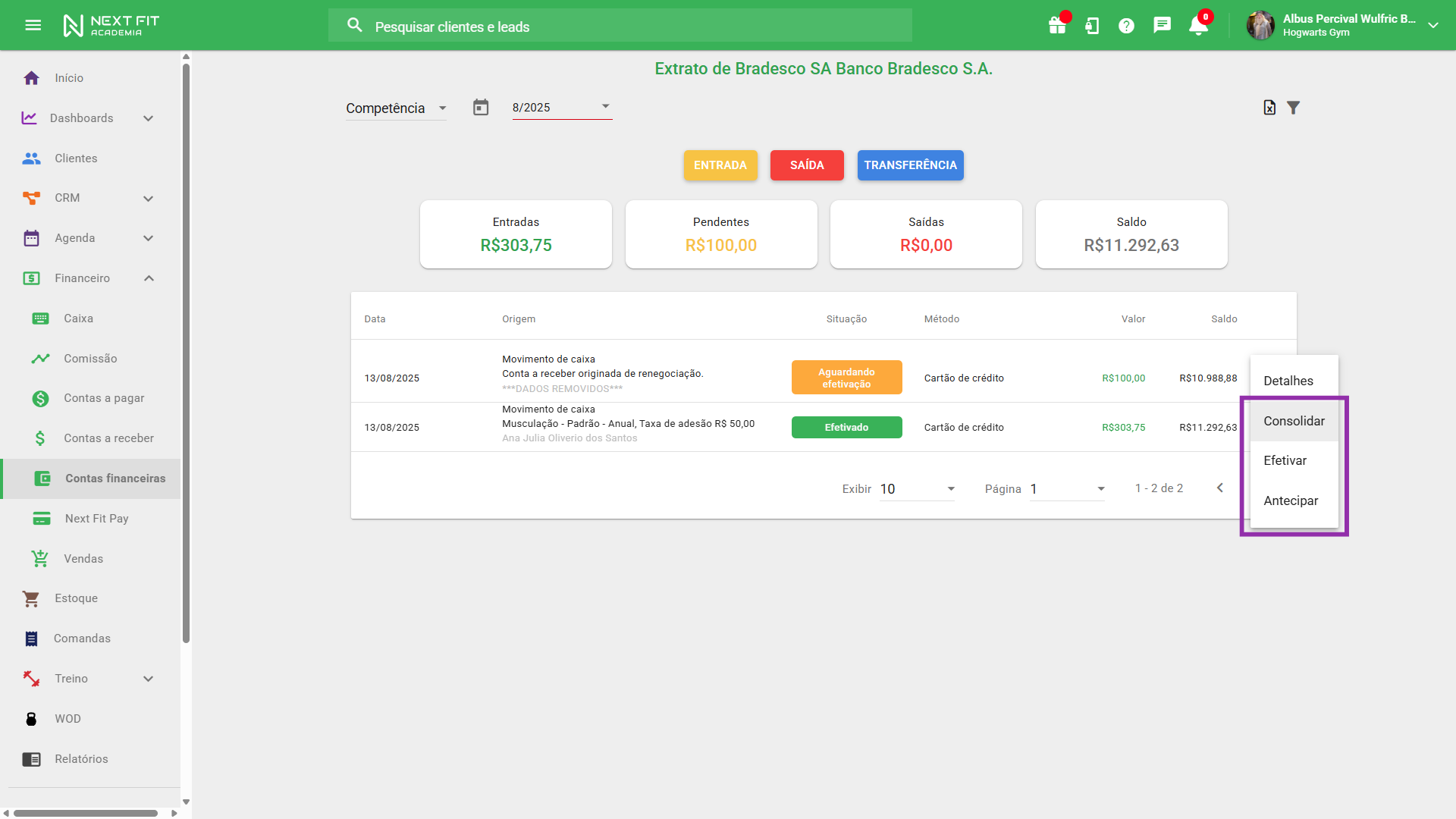 Os lançamentos no extrato da conta financeira podem estar em duas situações: Efetivado ou Aguardando efetivação.