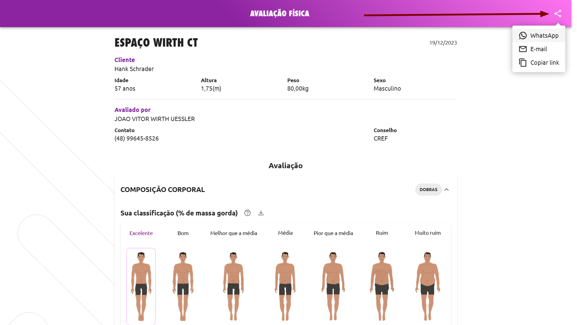 Opções de compartilhamento. Na tela da avaliação física clique no ícone de compartilhar no canto superior direito e escolha a forma de envio preferida dentre: WhatsApp, E-mail, Copiar link.