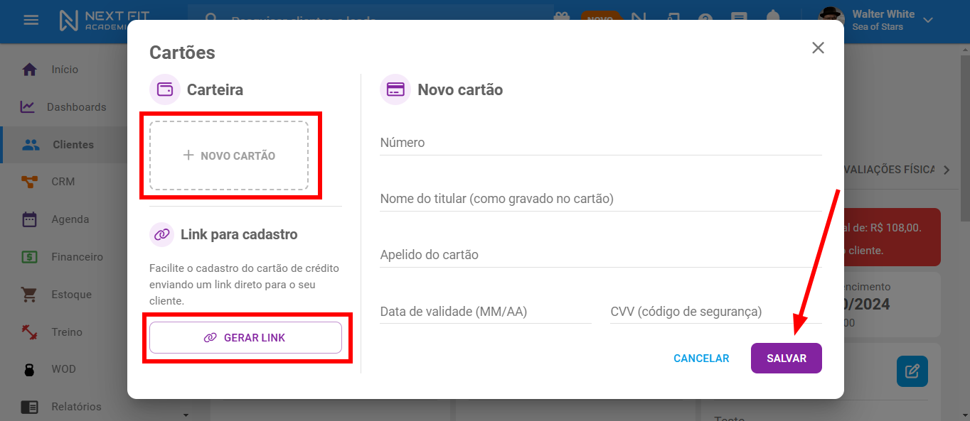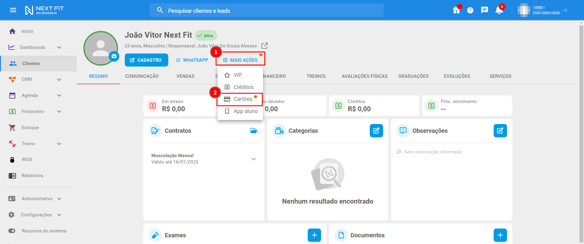 Para cadastrar o cartão de crédito do aluno, clique no ícone MAIS AÇÕES > Cartões, no perfil do cliente, próximo ao nome do aluno(a).