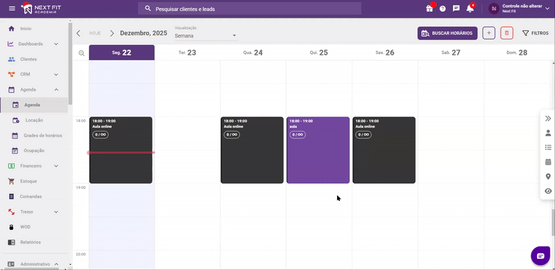 No módulo de agenda, o Next Fit permite você visualizar de diferentes formas, para deixar da maneira que fique mais confortável para sua gerência, também sendo possível a utilização de filtros para localizar apenas os horários desejados.