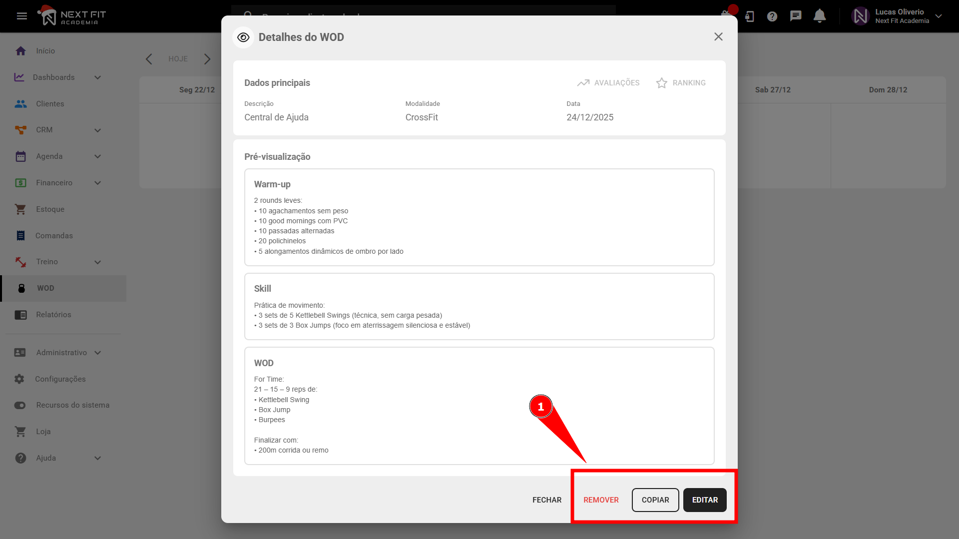 Alterações no WODCaso deseje realizar alterações após criar seu WOD, basta clicar no mesmo, você terá três opções, sendo: