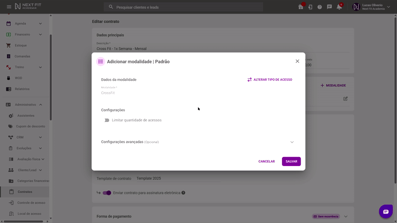 Agora, na edição da modalidade, clique em ALTERAR TIPO DE ACESSO. Na tela de "Adicionar modalidade no contrato" defina em algumas das opções que utiliza agenda, sendo elas: Sessões por semana ou Pacote de aulas, e clique em AVANÇAR, realize as configurações como desejar, e finalize em SALVAR.
