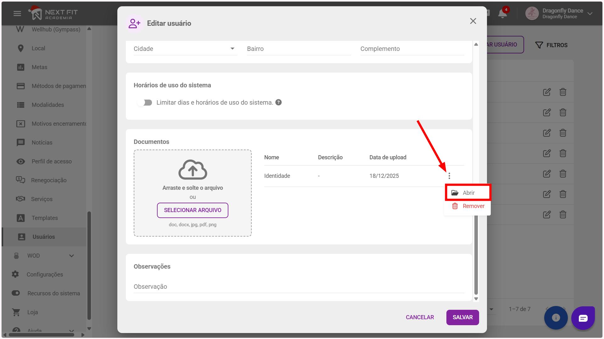 Visualizando o documento Para visualizar os documentos anexados no usuário clique em Três pontinhos > Abrir.