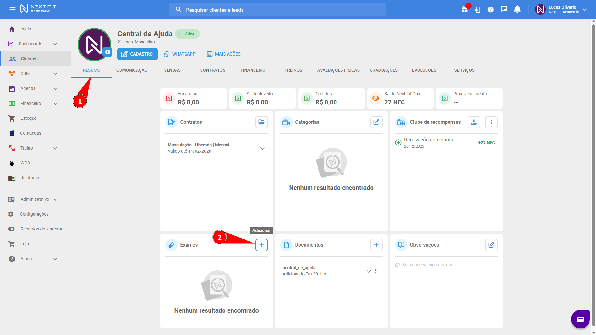 Como anexar o exame ao perfil do aluno? Para adicionar o exame, entre no perfil do aluno e, na aba de RESUMO, clique no botão de ADICIONAR (símbolo de +) no cartão de Exames.