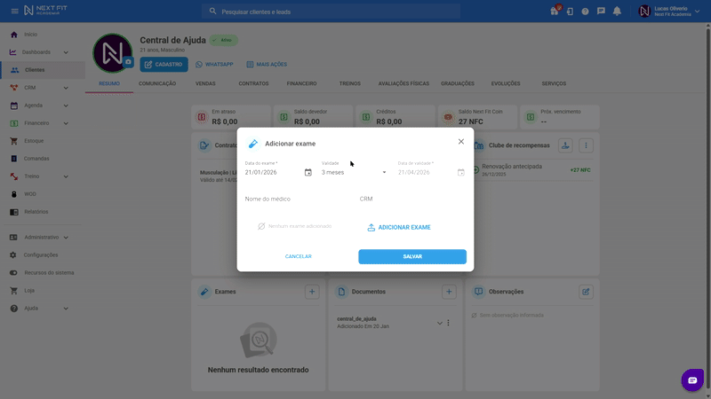 Olá! Neste tutorial você irá aprender como cadastrar um exame médico no perfil do cliente e como bloquear caso o exame estiver ausente ou vencido!