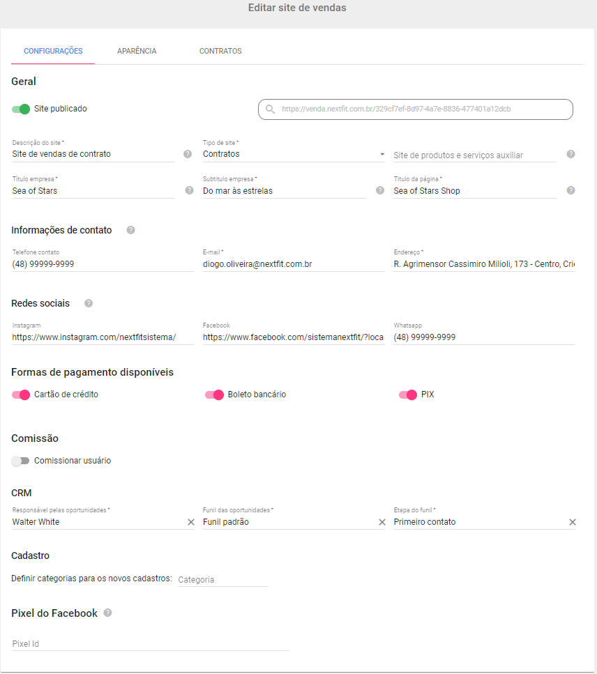O site de vendas tem como foco disponibilizar contratos, produtos e serviços para serem adquiridos pelos alunos de forma virtual. Com ele, você vende de forma virtual, e os alunos pagam pelo Next Fit Pay.