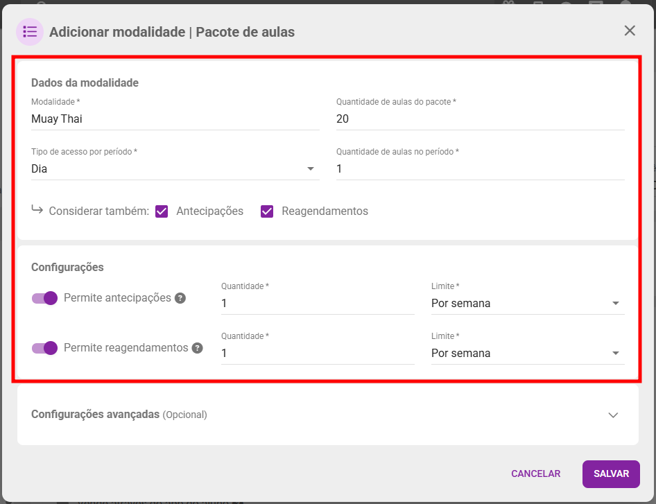 - Permite reagendamentos: caso você queira permitir ao aluno a possibilidade de cancelar aulas já agendadas para remarcá-las em um momento mais oportuno. Escolha a Quantidade e o Limite de antecipações.