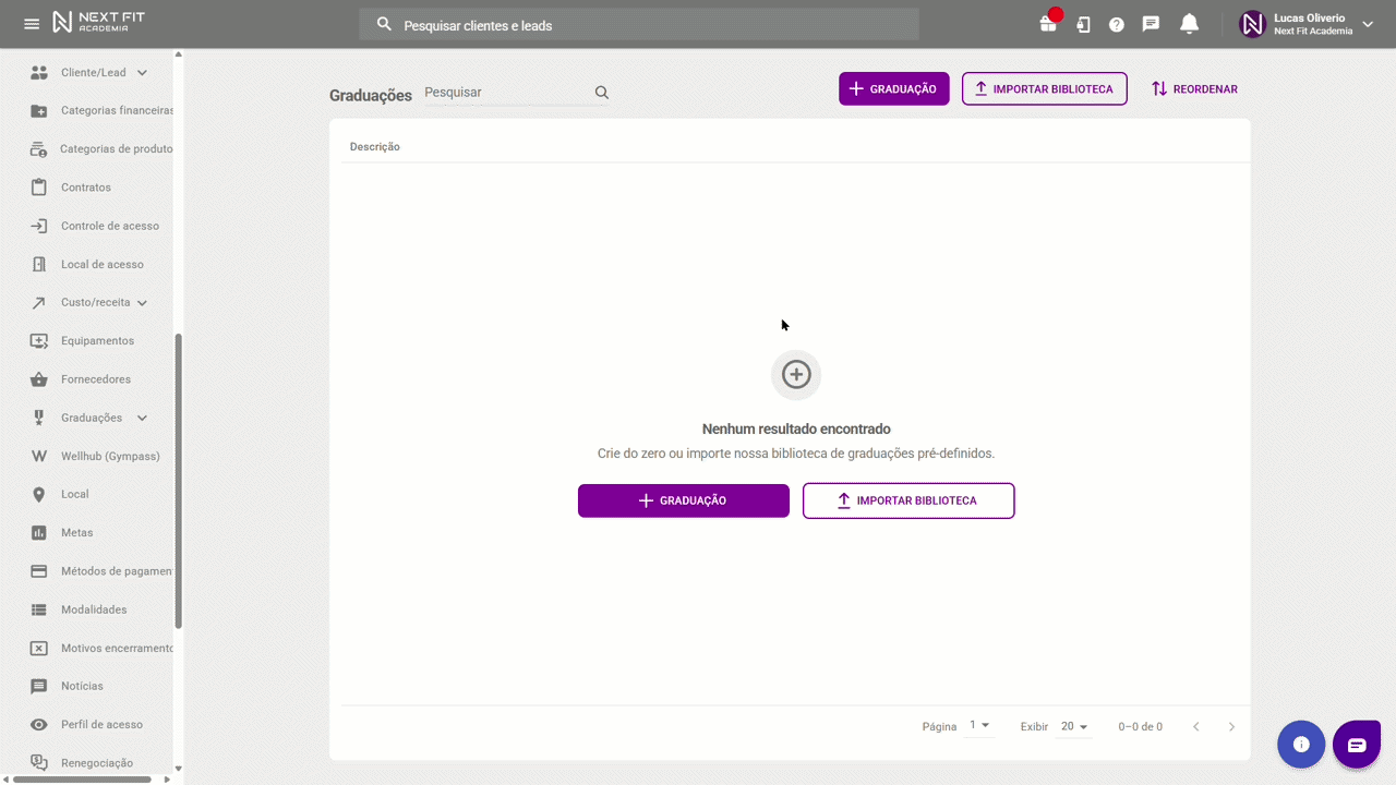 Cadastrando a graduação na modalidadeA Next Fit oferece duas formas de cadastrar graduações: importando bibliotecas prontas para modalidades específicas ou criando-as manualmente.