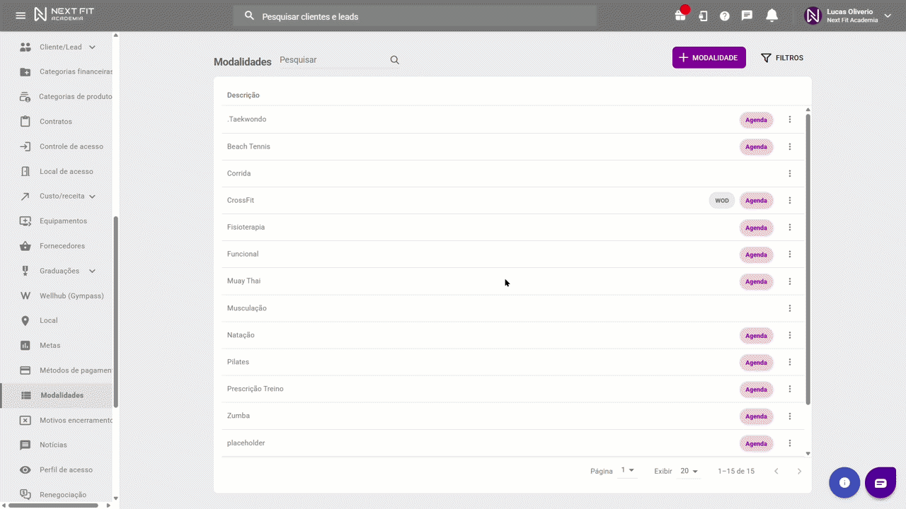 Acesse Administrativo > Modalidades, clique nos três pontos ao lado da modalidade desejada e selecione Graduação.