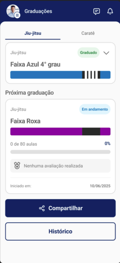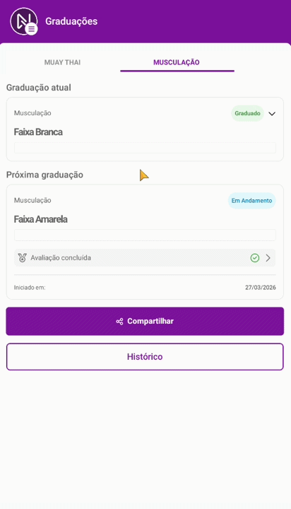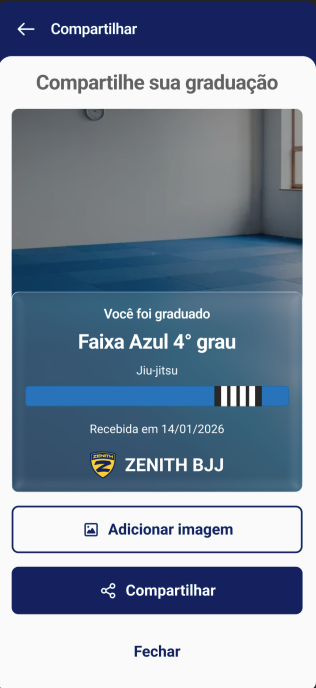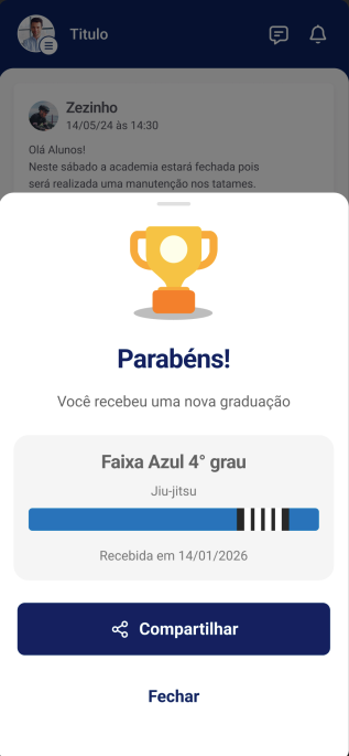 Além de visualizar o progresso, o aluno pode celebrar suas conquistas! Ao receber uma nova graduação, uma tela especial de parabéns é exibida, e ele pode compartilhar sua graduação nas redes sociais diretamente pelo aplicativo, aumentando o engajamento e a visibilidade do seu negócio.