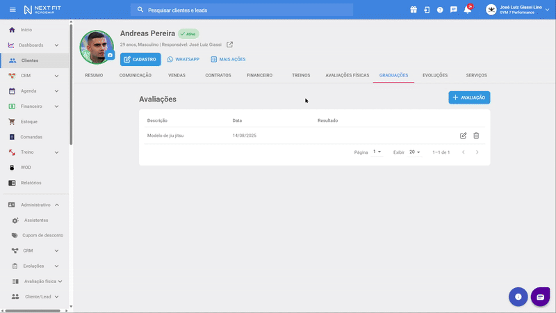 O Relatório de Graduações em andamento vai trazer todos os alunos vinculados a uma graduação e seu progresso. Para acessar este relatório vá em Relatórios > Clientes > Graduações em andamento.