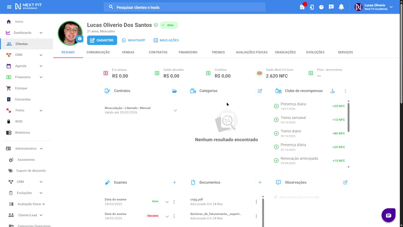 Nesta página, você pode visualizar o PSE do aluno, a nota que deu ao treino bem com a observação escrita.
