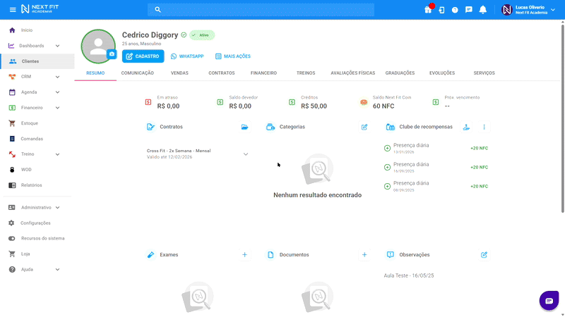 Para isso, no perfil do aluno clique em CONTRATOS > três pontinhos > Detalhes > [MODALIDADE] > REMOVER (ícone de lixeira) > SIM.