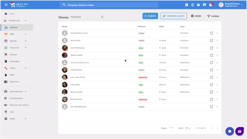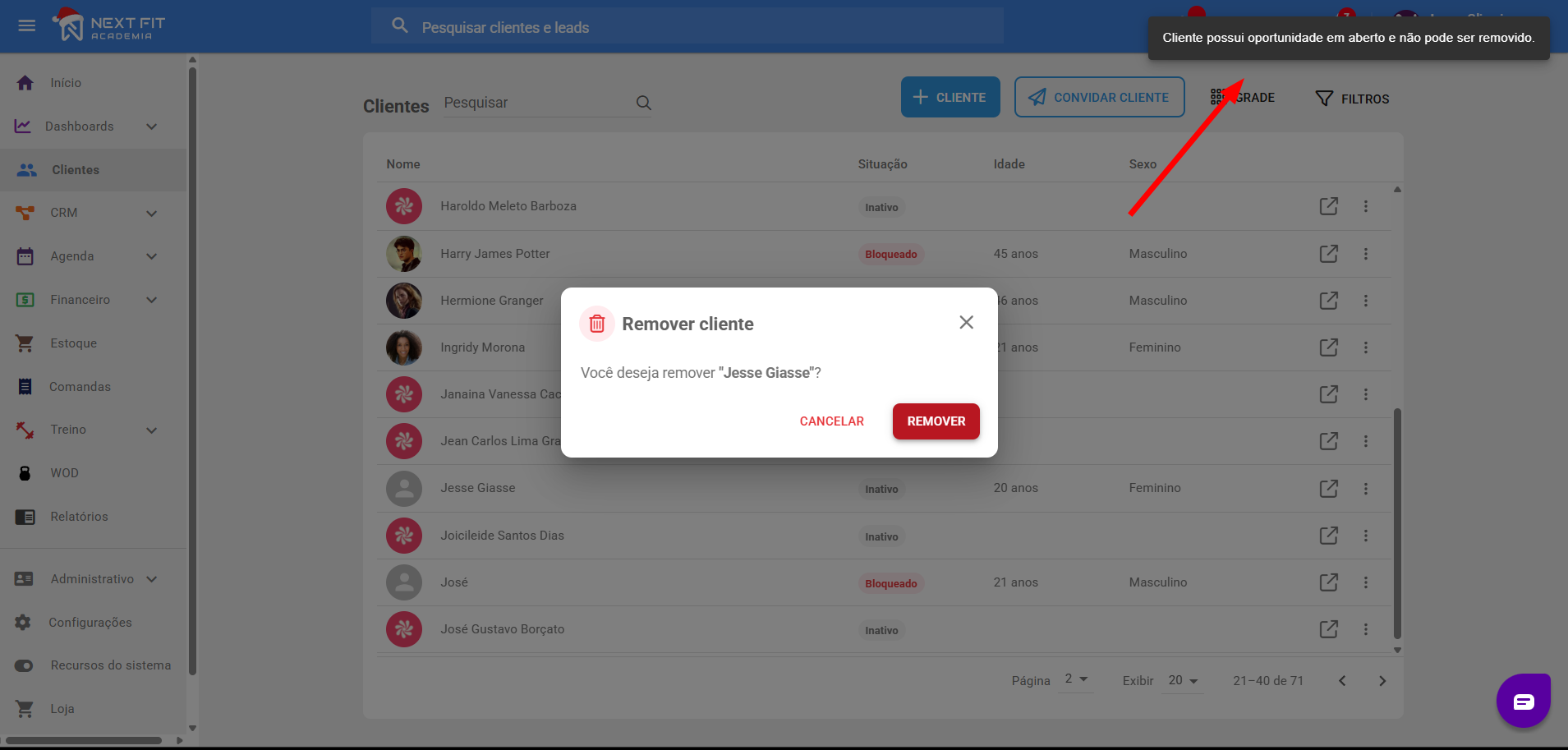Removendo um clientePara remover o cadastro do aluno, acesse Clientes > Cadastro do aluno (a) > 3 pontinhos > Remover.