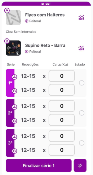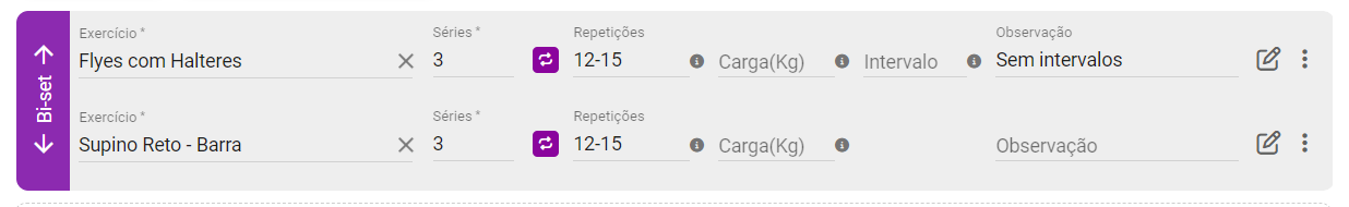 Superséries (bi-set, tri-set e super-set)No exercício, em Três pontinhos > Bi/Tri/Super-set você pode criar exercícios conjugados, quando a execução dos exercícios será com séries alternadas. No exemplo abaixo, criamos um Bi-set de "Supino Reto - Halter" e "Crucifixo - Halter".