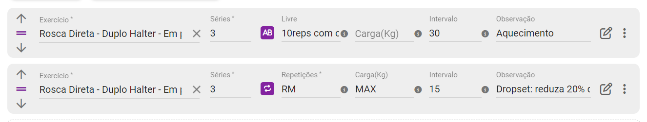 Depois, adicione o mesmo exercício, mas agora para o Dropset: