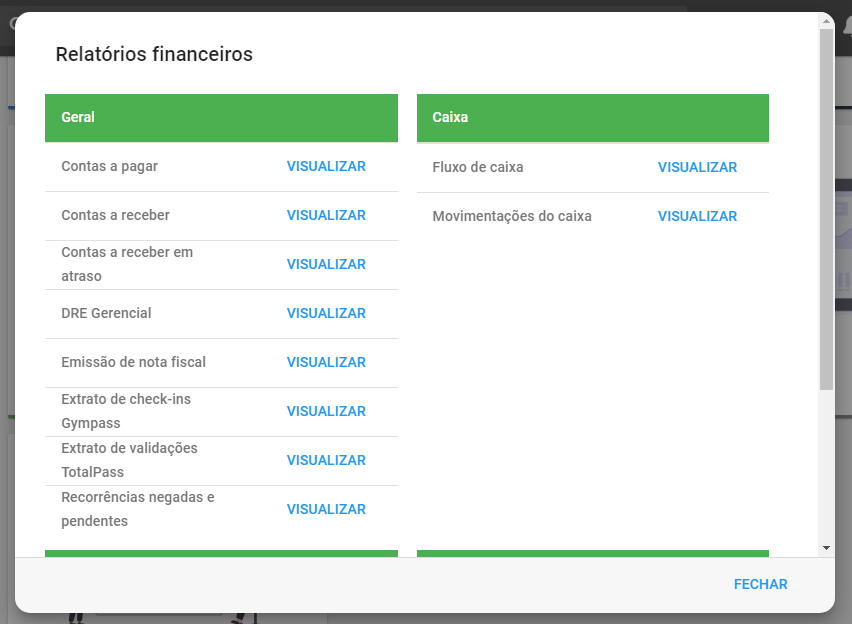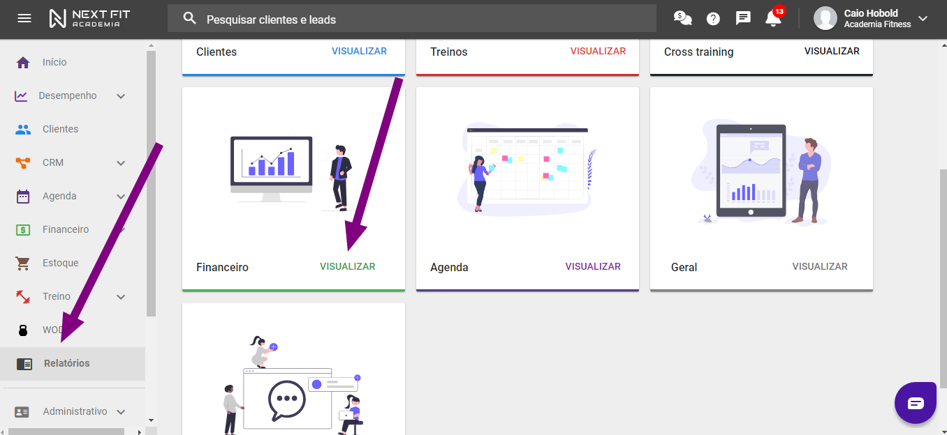 Para acessá-los, acesse o módulo Relatórios e depois clique em Financeiro.