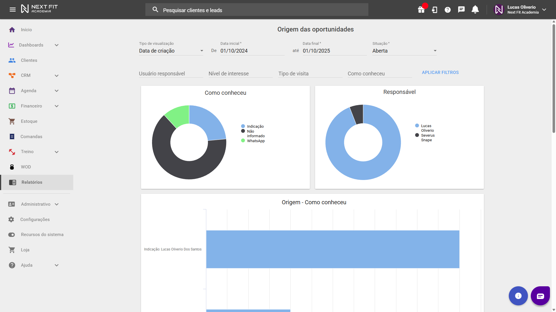 - Relatório de Origem das oportunidades: no relatório de “Origem das oportunidades”, você conseguirá analisar por qual canal a oportunidade conhecer o seu estabelecimento, o tipo de visita que realizou, o responsável pela oportunidade, entre outros filtros que podem facilitar sua gestão.