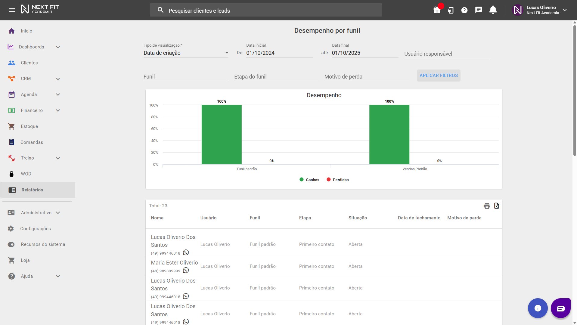 Relatório de Conversões de oportunidades: no nosso sistema, chamamos de “leads” as pessoas com potencial para se tornarem clientes, mas ainda não compraram nenhum dos seus planos. Essas pessoas podem ser cadastradas como lead para agendar uma aula experimental, por exemplo.