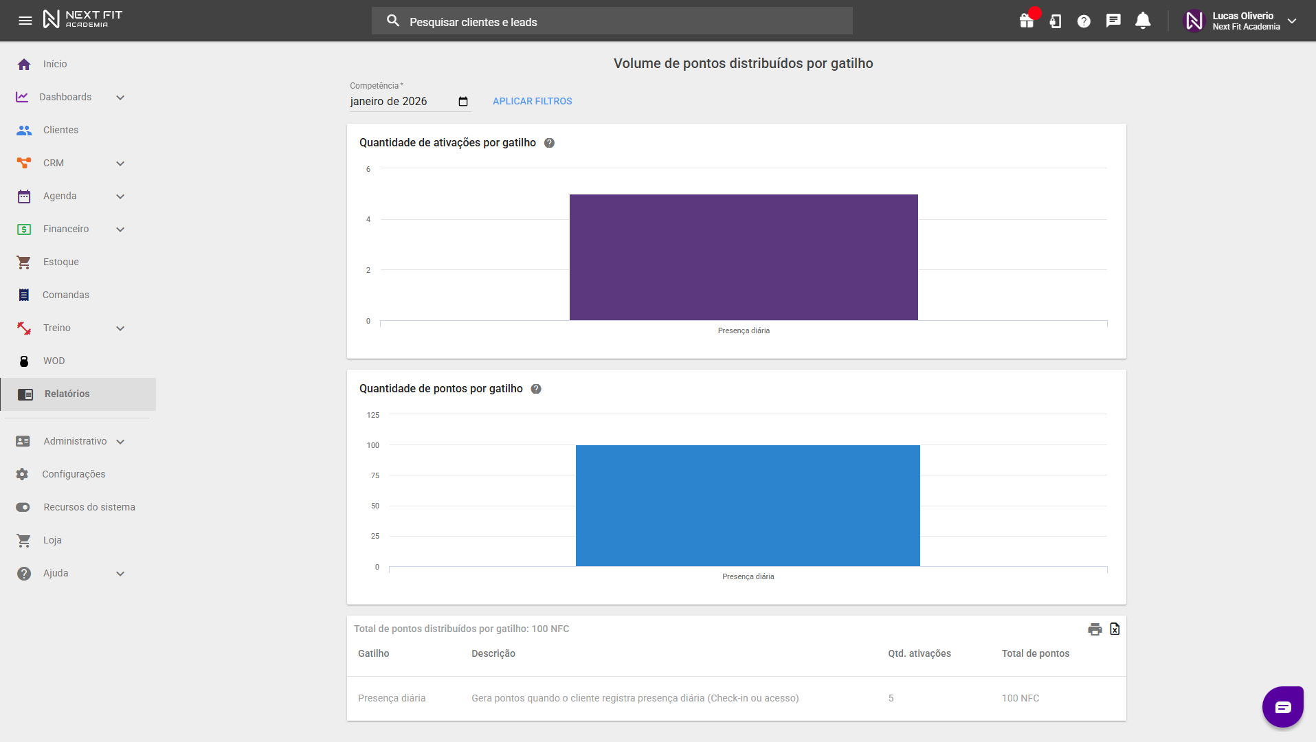 - Volume de pontos distribuídos por gatilho: se você utiliza o Clube de Recompensas, este relatório é fundamental para auditar e entender a distribuição de pontos. Aqui, você analisa quais ações (gatilhos) estão sendo mais realizadas pelos seus alunos.
