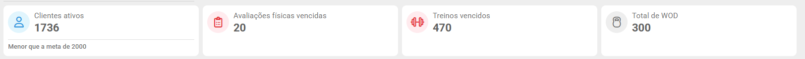 - Avaliações físicas vencidas: informa a quantidade de avaliações físicas vencidas;