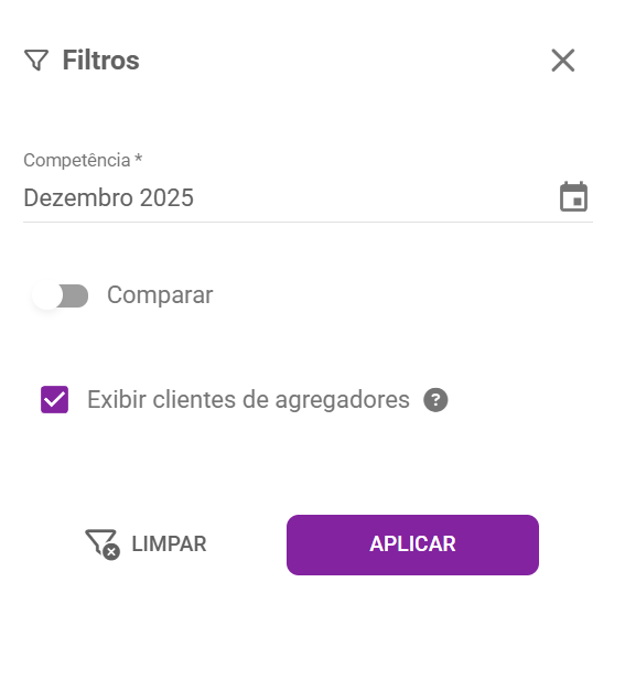 • Competência: período de tempo que irá aparecer nos relatórios, uma competência é mensal, ou seja, os dados serão filtrados do primeiro ao último dia do mês selecionado.