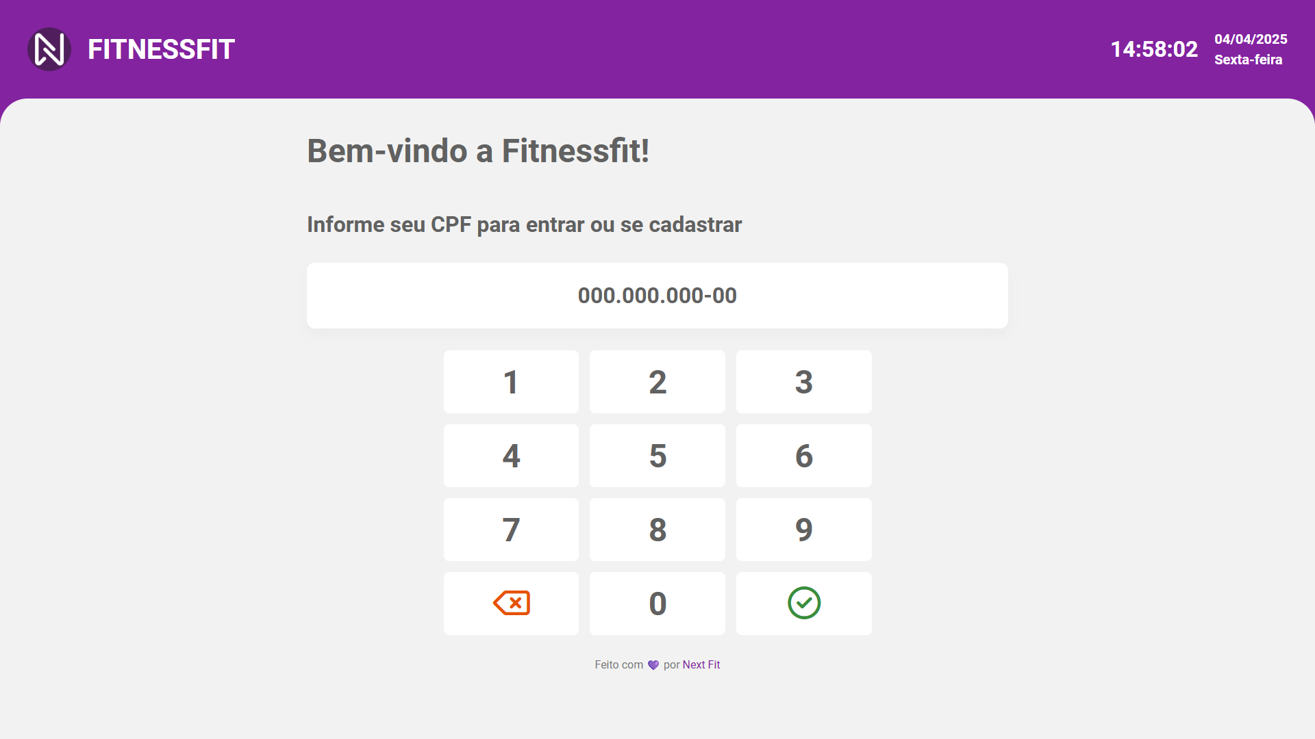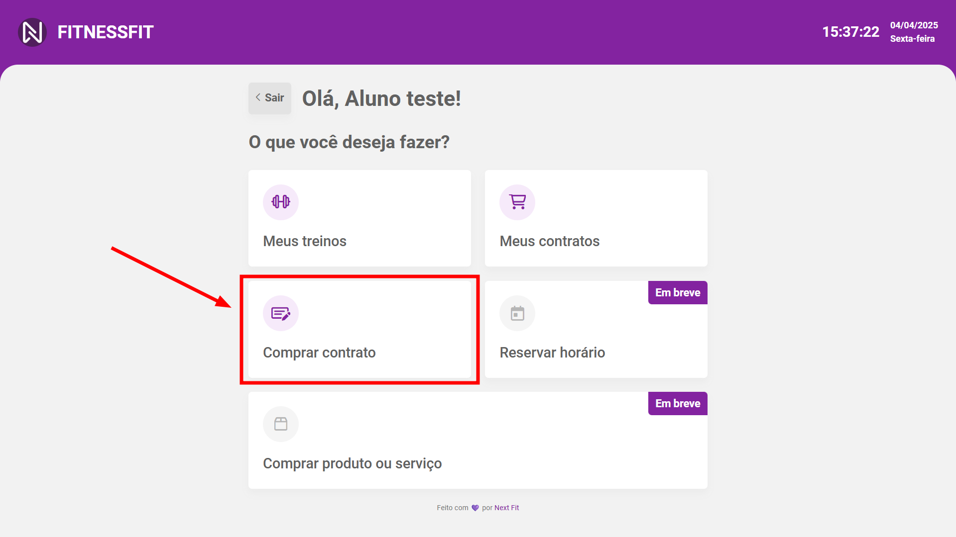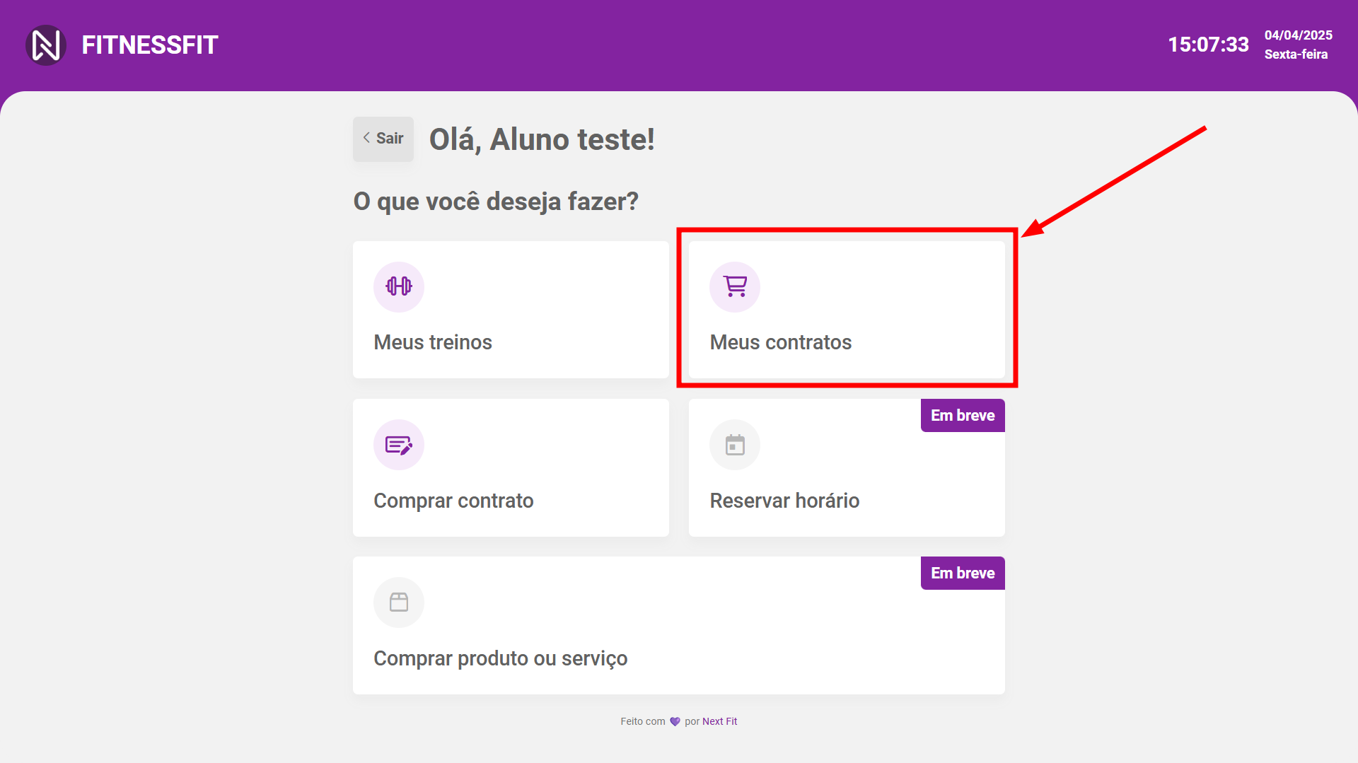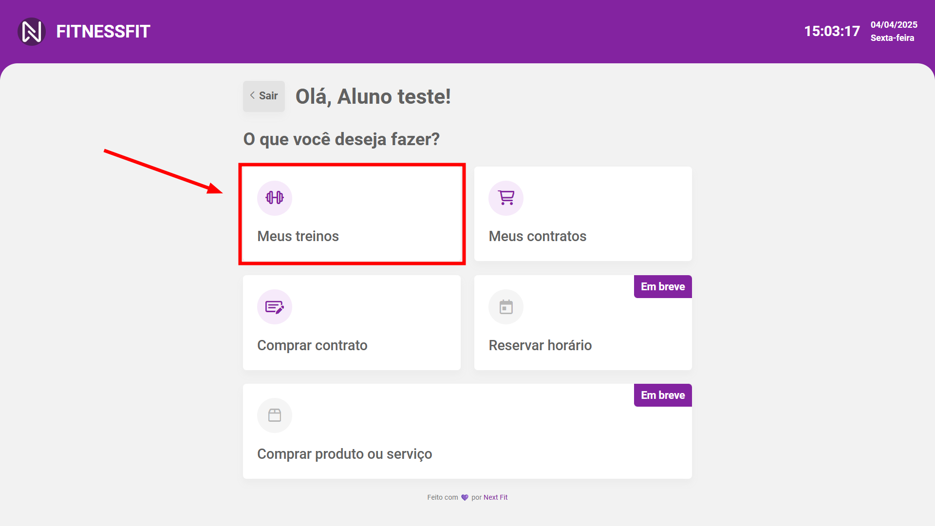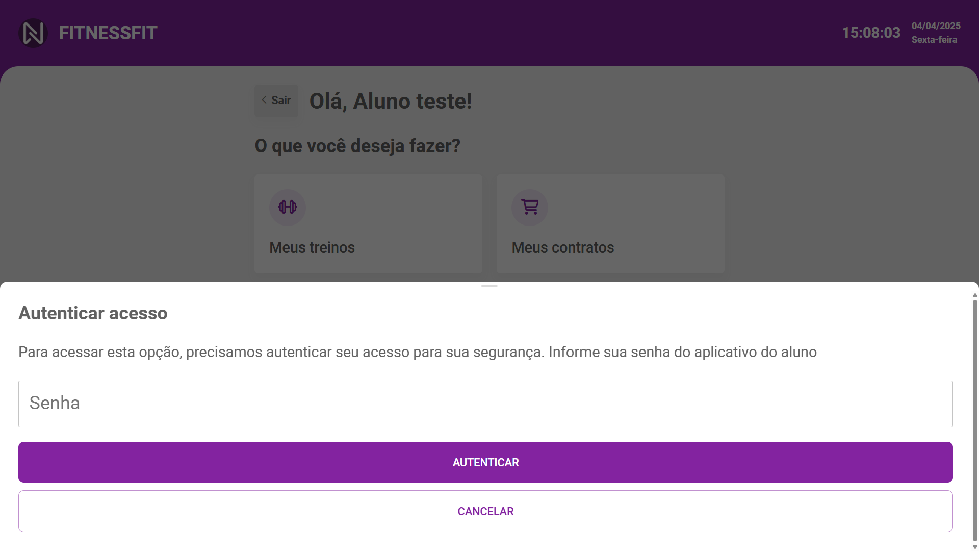 O aluno utilizando seu CPF poderá acessar seu cadastro, ou caso não possua um ainda, poderá estar se cadastrando. Caso o aluno seja um responsável, ele também poderá cadastrar seus dependentes. Após o acesso, o aluno terá visão de seus treinos, contratos e também a possibilidade de realizar aquisição de novos contratos.