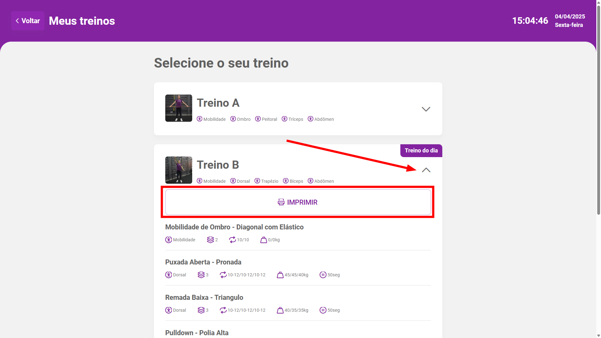 Impressão de treinoSelecionando a opção Meus treinos o aluno terá a visualização das sessões de seu treino, onde irá selecionar o treino desejada e então clicar em IMPRIMIR para realizar a impressão do treino selecionado.