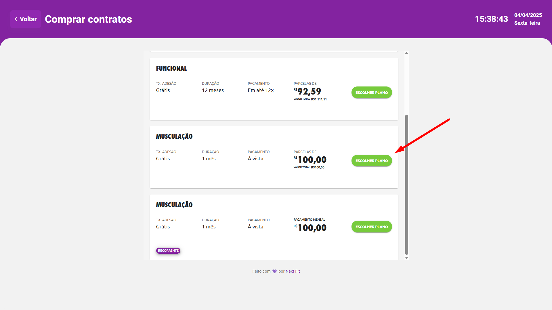 Compra de contratosSelecionando a opção Comprar contrato, o aluno terá uma visualização da listagem de contratos que colocou à venda no site vinculado ao totem. Onde após encontrar o contrato desejado o aluno pode realizar a compra na opção ESCOLHER PLANO.