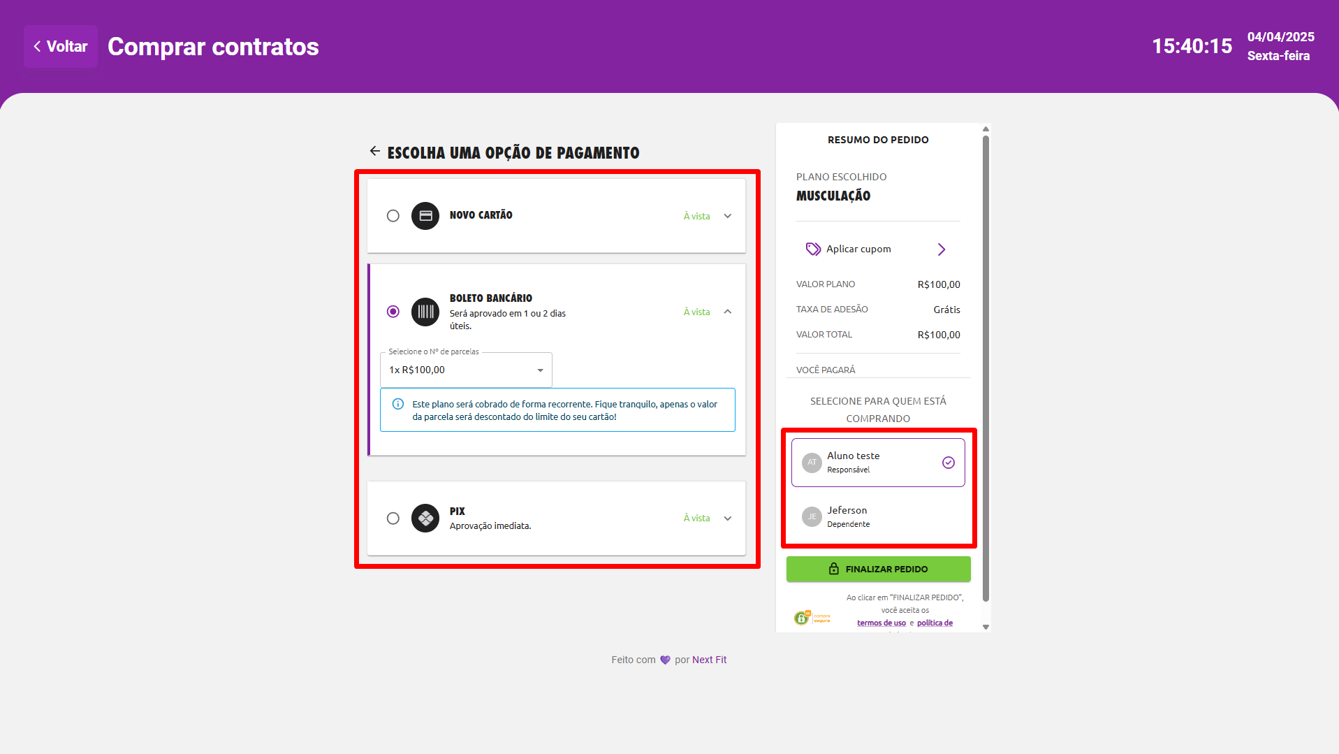 Após a escolha do contrato, o aluno poderá definir o método de pagamento, dentre os métodos configurados no site de vendas. Caso seja um responsável, é possível escolher um dependente para receber o contrato. E então finalizar o pedido em FINALIZAR PEDIDO.