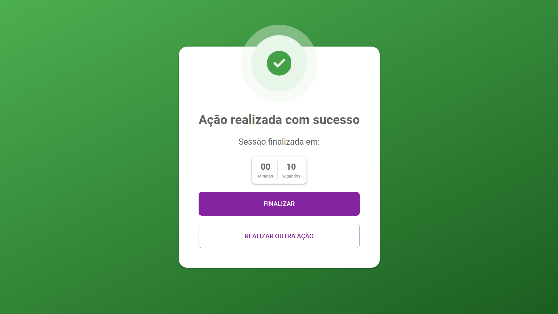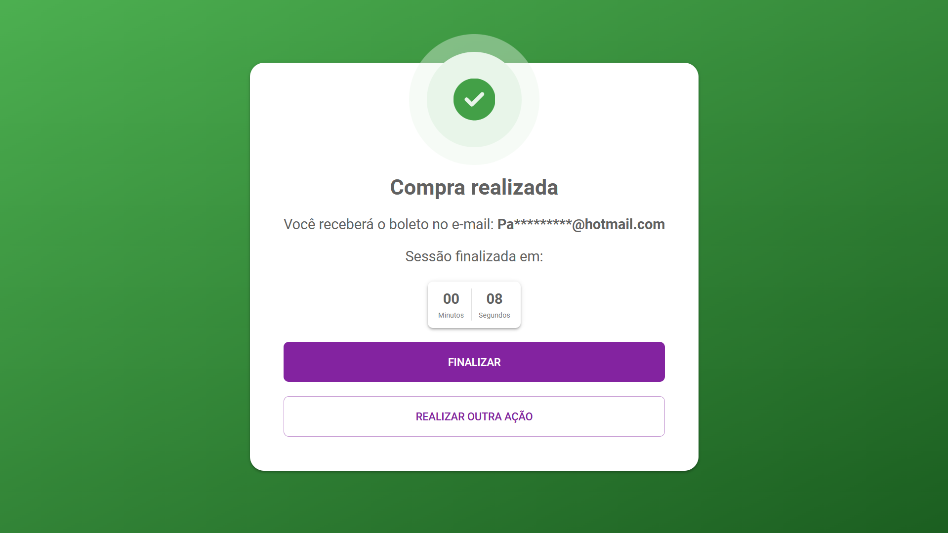 Tela de finalização ao realizar uma compra