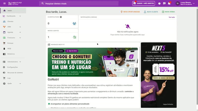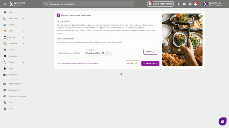 Observação: ao ativar o Next Fit Pay para oferecer o GoNutri aos seus clientes, não é necessário realizar outras cobranças (como de seus planos/contratos, por exemplo) pelo Next Fit Pay caso não seja de seu interesse.