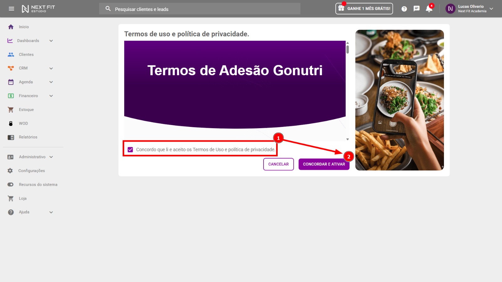 Para finalizar a ativação do GoNutri, você deve realizar a leitura dos Termos de uso e política de privacidade, e então selecionar a opção de Concordo que li e aceito os Termos de uso e política de privacidade e então clique em CONCORDAR E ATIVAR.
