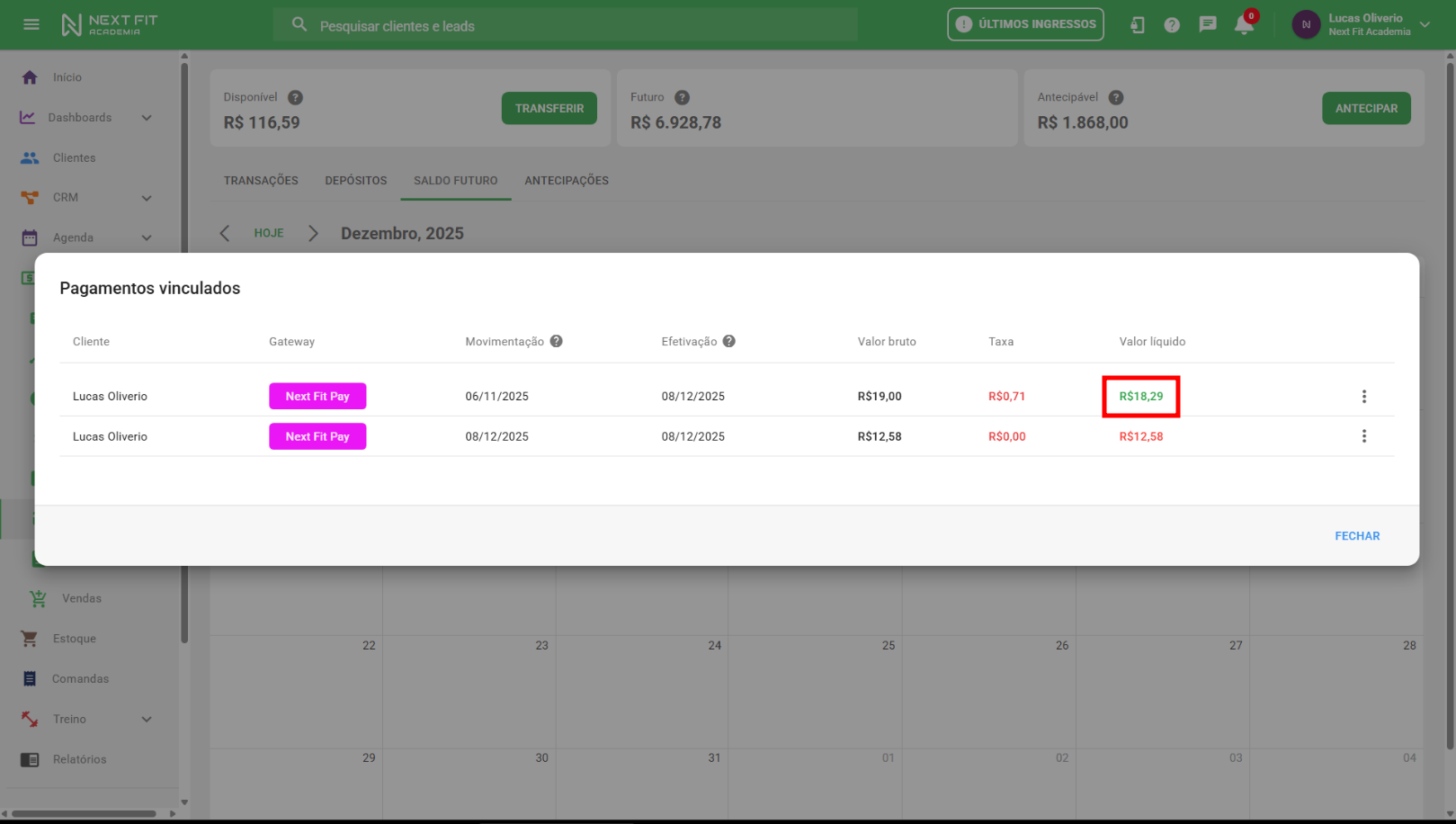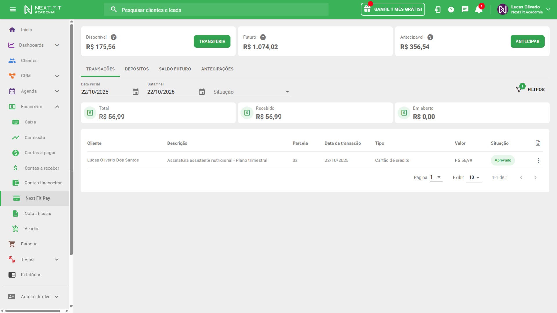 Conforme as datas de efetivação dos pagamentos, haverá um registro como entrada no valor a ser recebido, por você gestor, e uma saída referente ao valor que será repassado para a Next Fit. Compreenda mais detalhes abaixo, no tópico de "Comissão Next Fit".