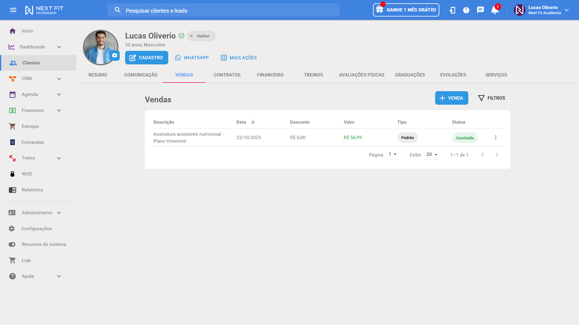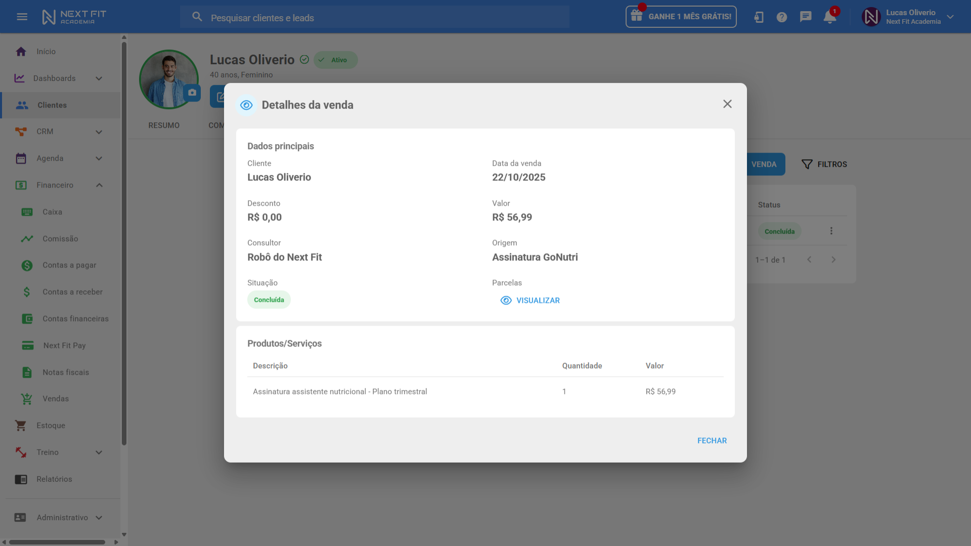 A primeira forma de acompanhar os valores, é diretamente pelo perfil de seu cliente. Quando a venda é confirmada (após os 7 dias de teste gratuitos), ela é registrada no perfil do cliente. Na descrição da venda estará constando a assinatura escolhida pelo cliente e, a origem da venda, será a Assinatura GoNutri.