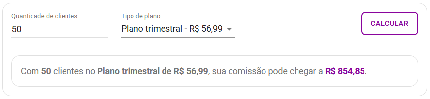O valor total da assinatura trimestral é de R$ 56,99 e, cada cliente que a adquirir, será gerada uma comissão no total de R$ 17,10, enquanto o valor total da assinatura anual é de R$ 179,99 e a cada cliente que a adquirir, será gerada uma comissão no valor total de R$ 54,00. Em ambos os casos, a comissão total é 30% do valor pago. Você não paga nada de taxa! A Next Fit cobre integralmente as taxas do Next Fit Pay e você apenas recebe o valor da comissão.