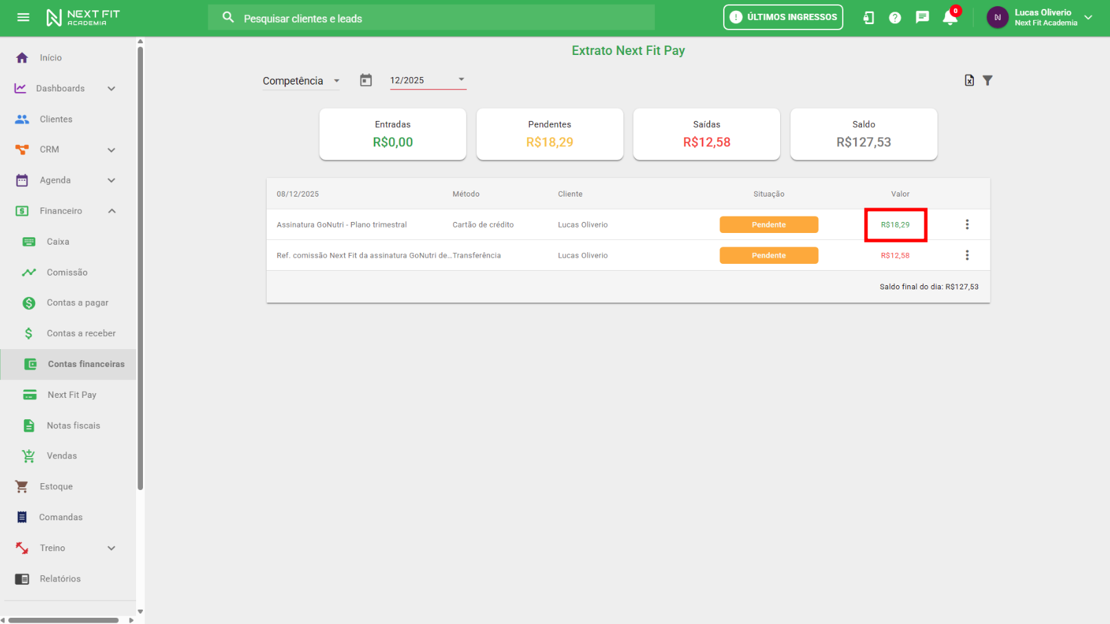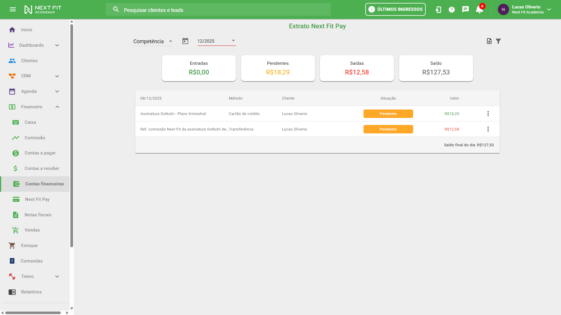 Por fim, uma maneira fácil de acompanhar os valores do GoNutri é através do extrato da conta financeira do Next Fit Pay. Acesse este recurso clicando em Financeiro > Contas Financeiras e, na conta financeira do Next Fit Pay, clique nos três pontinhos > Extrato.