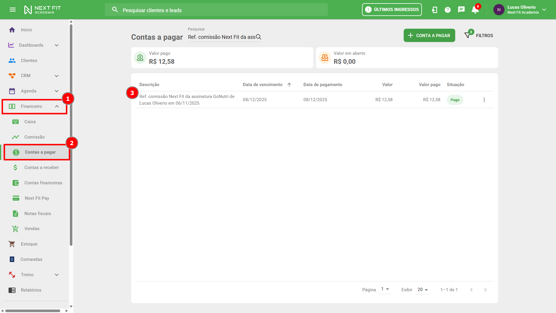 Além dos valores repassados para você, gestor, uma parte dos valores pagos pelos clientes é repassado para a Next Fit. Visando uma total transparência, através do módulo de Financeiro > Contas a Pagar, constará o valor total da comissão que foi gerada.