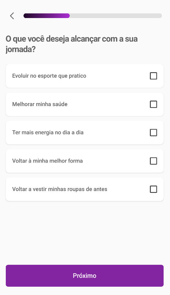 Leia os informativos presentes na tela de Boas vindas e então prossiga, clicando em Começar. Será solicitado uma confirmação de seus dados pessoais, onde você poderá ajustar, se necessário, o seu nome, data de nascimento e número de telefone e então clique em Próximo. Para finalizar esta etapa, confirme se a senha para o GoNutri será a mesma que você utiliza no aplicativo do aluno ou cadastre uma nova, conforme sua preferência.