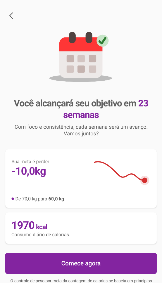 O próximo passo é o preenchimento dos dados pessoais (peso, altura, objetivos, restrição alimentar...). Preencha corretamente todos os dados solicitados, confirmando cada etapa clicando em Próximo. Ao finalizar todo o cadastro, o GoNutri irá apresentar a estimativa de tempo para atingir o seu objetivo, com a sua meta e o consumo diário de calorias estipulado, para iniciar, confirme clicando em Comece agora.