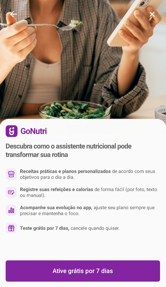 Após ter definido seus dados e metas, chegou o momento de decidir a assinatura que você deseja adquirir para utilizar o GoNutri. Inicialmente você possuirá 7 dias de teste gratuitos para avaliar o recurso. Clique em Ative grátis por 7 dias para prosseguir.