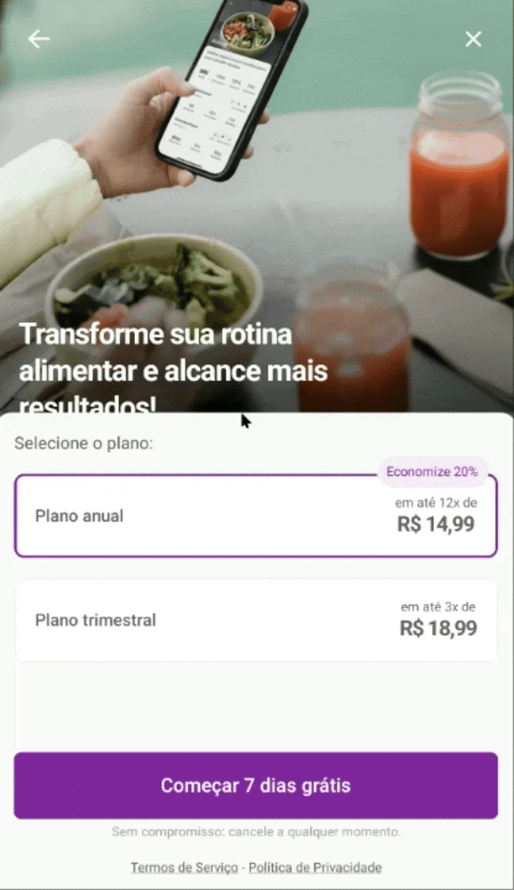 Mesmo possuindo 7 dias de teste gratuito, no momento em que você está configurando o GoNutri, já deve ser definida qual assinatura você deseja adquirir. Escolha entre a assinatura Anual ou Trimestral e prossiga em Começar 7 dias grátis. Então defina o método de pagamento - cartão de crédito ou PIX - e finalize, prosseguindo em todas as etapas.