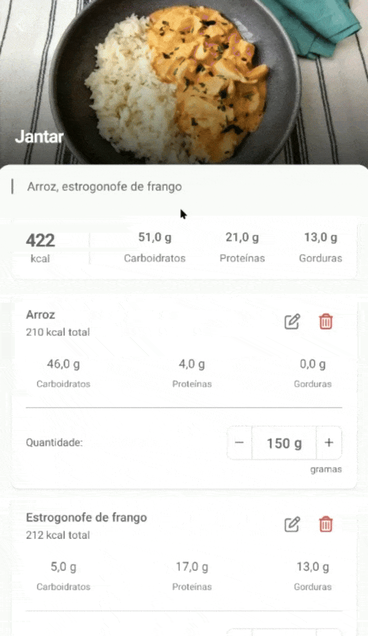 - Ajustar quantidade: caso a IA estimou "1 fatia" de pão, mas você comeu "2", você pode simplesmente alterar manualmente o campo "Quantidade". Ao fazer isso, o sistema irá recalcular automaticamente todos os macros (calorias, carboidratos, etc.) de forma proporcional.