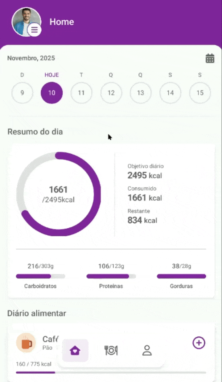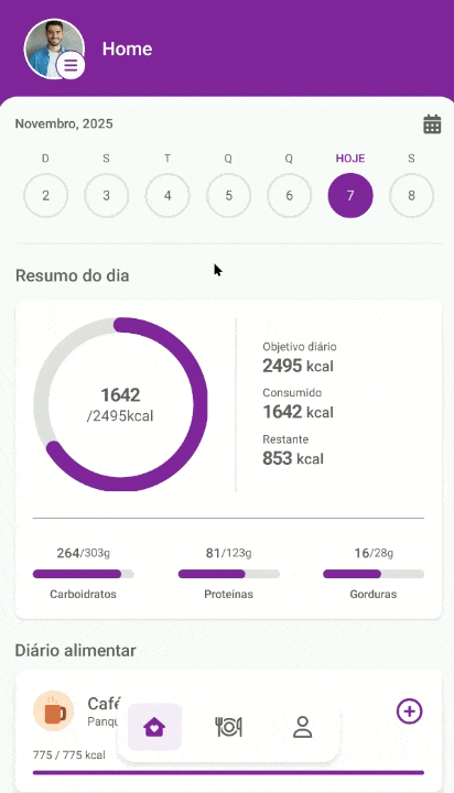 - Resumo do dia: uma visão clara de suas calorias (Consumidas, Meta Diária e Restantes) e a distribuição de macronutrientes (Carboidrato, Proteína e Gorduras).