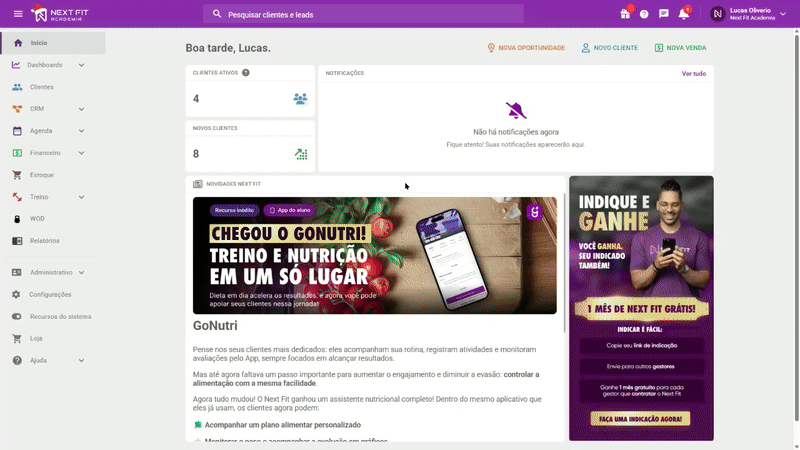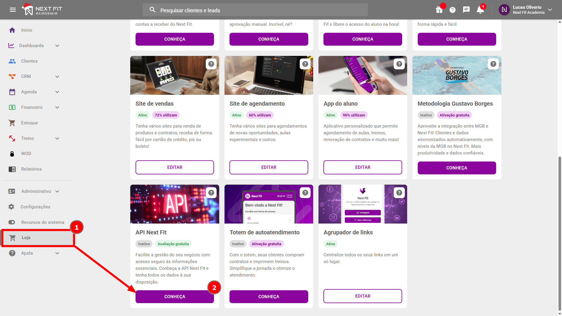 Quais informações podem ser consultadas?Através da nossa documentação, você terá acesso a diversos "endpoints" (pontos de consulta) que permitem extrair dados vitais, como dados da sua agenda, financeiro, contratos, vendas, CRM e clientes. Para acessar a documentação, clique em Loja e, no cartão de API Next Fit, clique em CONHEÇA.