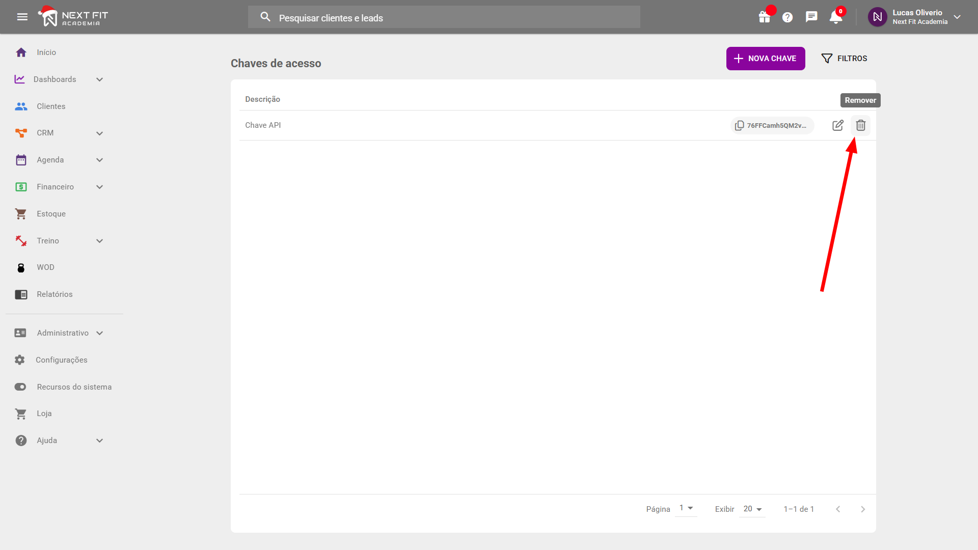 Após o período de teste, a chave que estava ativa é desativada automaticamente. Dessa forma, para permanecer com o recurso ativo e em funcionamento, você deverá criar uma nova chave manualmente. Para realizar este processo, entre no módulo de Loja > EDITAR (no cartão de API Next Fit) > VER MINHAS CHAVES > + NOVA CHAVE. Defina um nome para sua chave e finalize clicando em SALVAR.